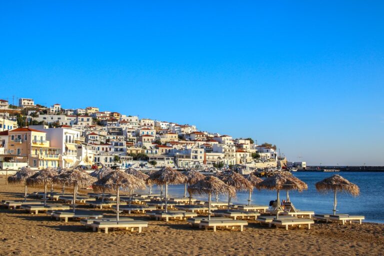 Agia Marina Beach in Andros is located on the west side of the island. It is a beautiful beach with sand and trees with shade for protection from the sun. Above the beach, there is a traditional tavern.