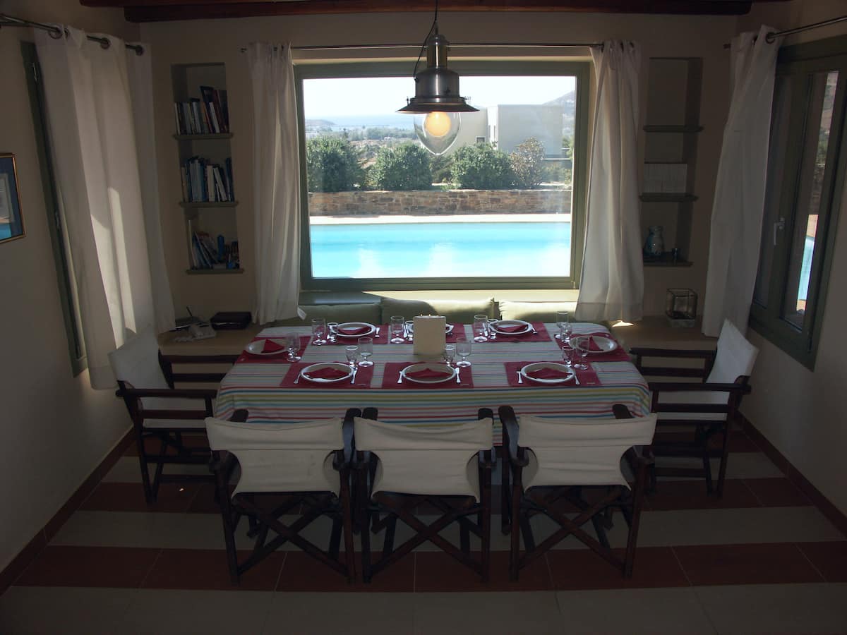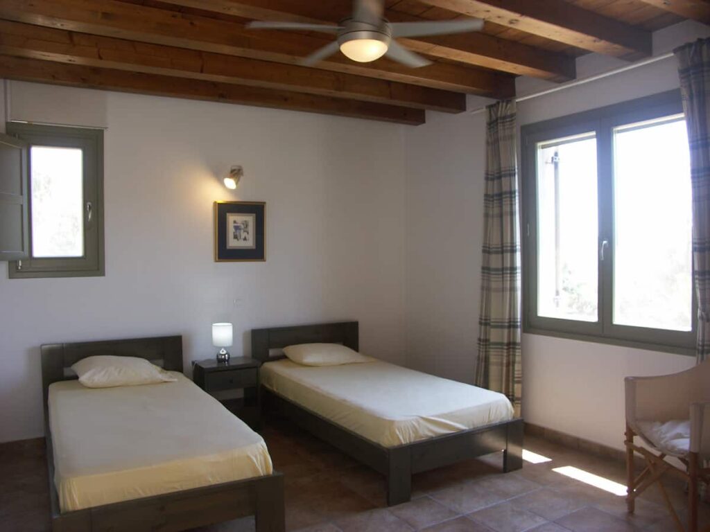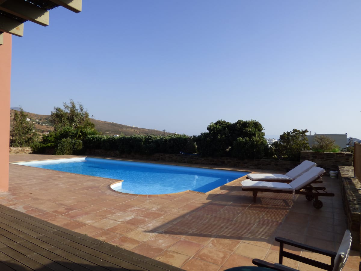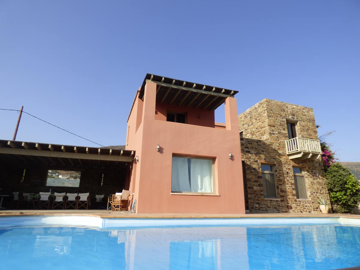 The villa features 5 spacious bedrooms with 10 beds and 4.5 bathrooms, comfortably accommodating up to 12 guests — ideal for families, groups of friends, or multi-family getaways. Outside, a magnificent 60 m² private swimming pool and hot tub await, perfect for cooling off on warm summer days and unwinding under the Aegean sky. Inside, you will find a fully equipped kitchen, flat screen TV, WiFi, and central air conditioning for a comfortable stay in every season.