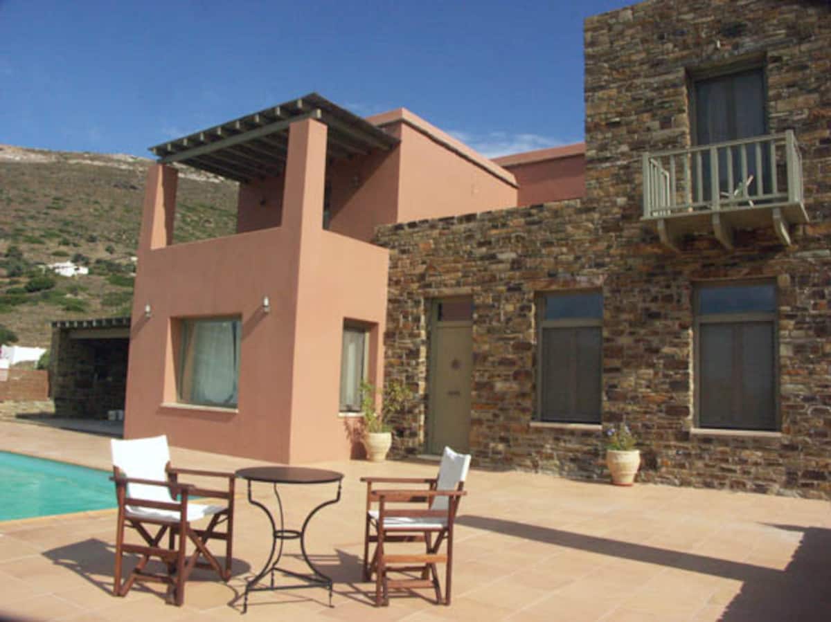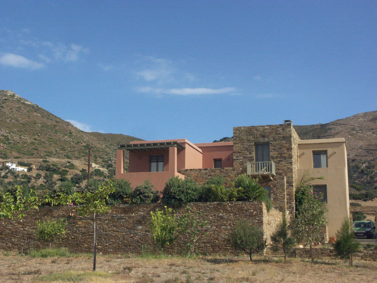 The estate enjoys a peaceful hillside location just 1.5 km from Gavrio village, where you will find everything you need — pharmacy, supermarket, bakeries, a market with local products, cafes, and traditional tavernas. Beautiful beaches are within easy reach, and the proximity to the port makes it an excellent base for exploring all corners of Andros. Pets are welcome, and free on-site parking is provided.