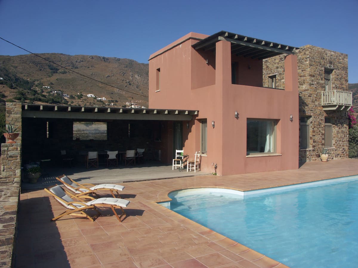 Alma Houses Andros is a stunning two-story villa of 230 m² set on a private 5,000 m² estate near the port of Gavrio, the main gateway to Andros island in the Cyclades. Built in 2007, the villa offers a perfect blend of modern comforts and absolute privacy and tranquility, surrounded by the serene Andriot countryside with sweeping views of the sea, the port, and the surrounding hills.