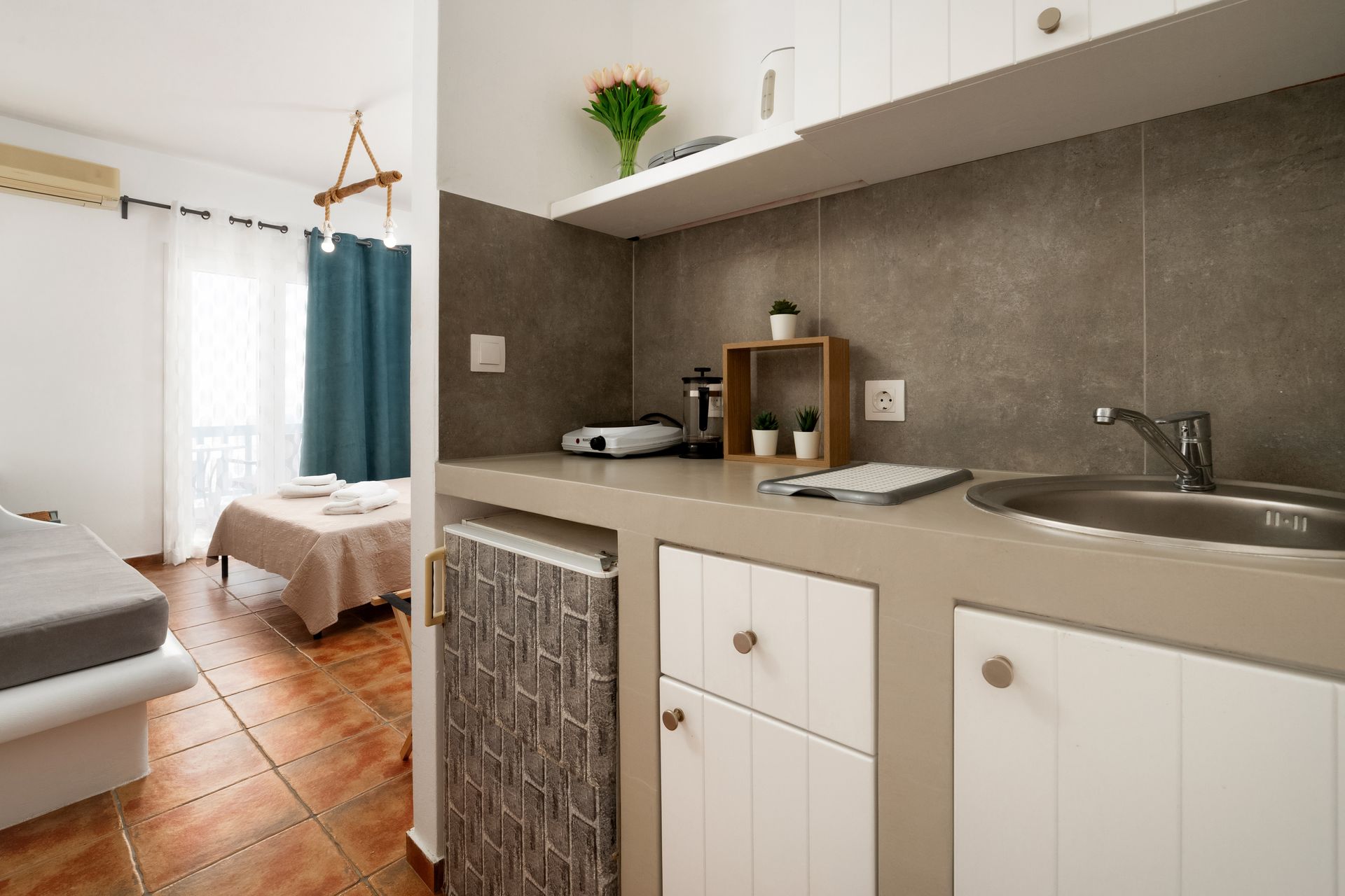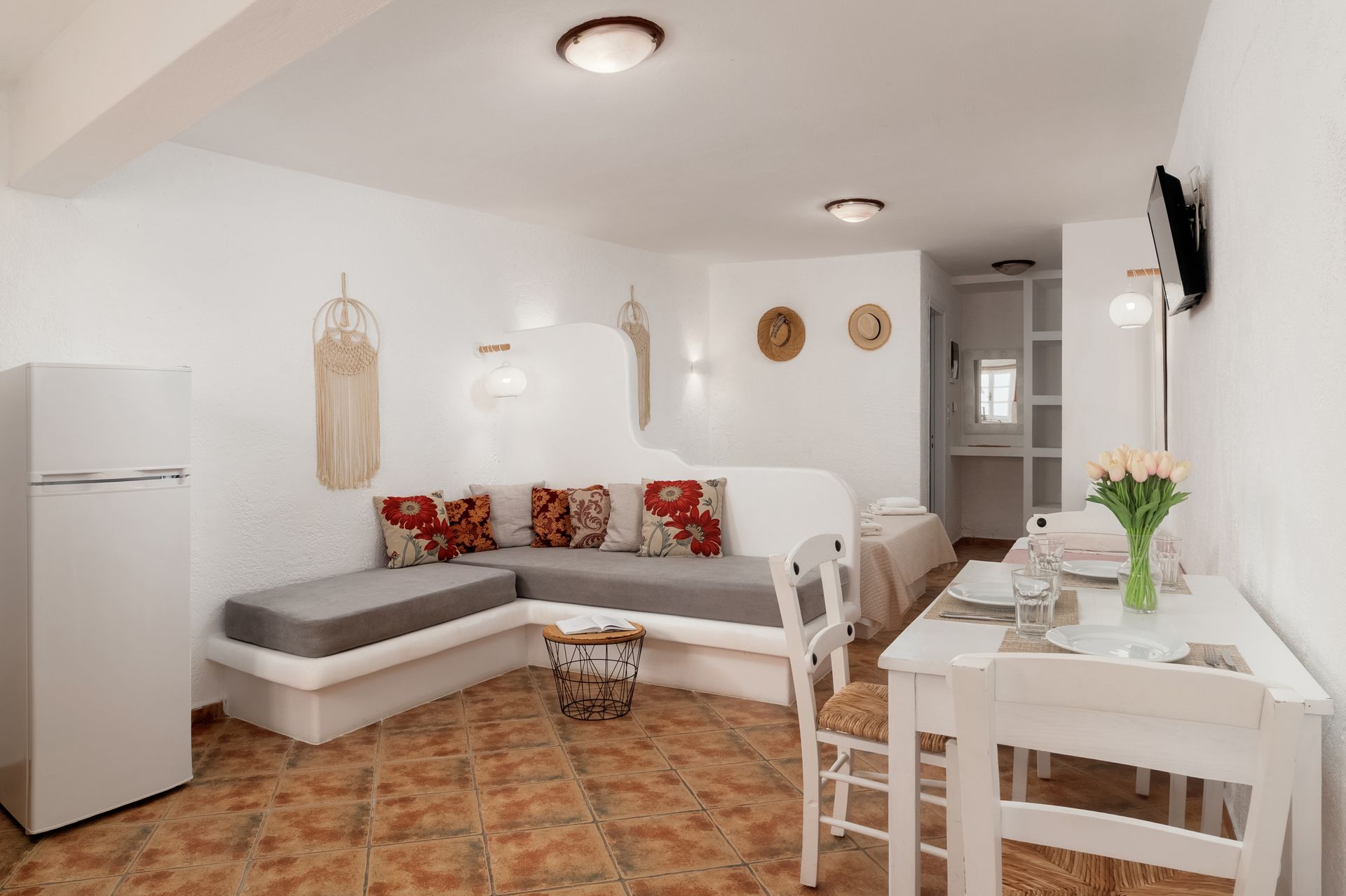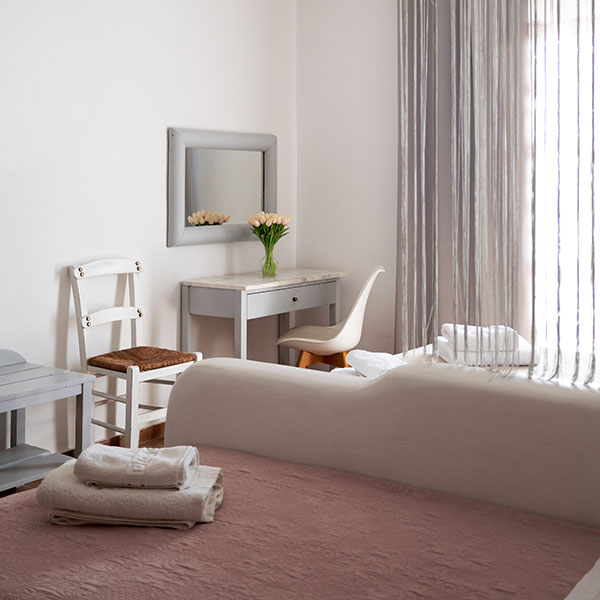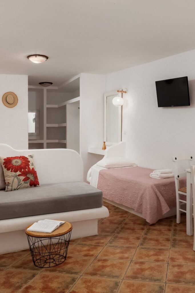 The property features four accommodation types to suit every guest: Superior Double Sea View rooms, Triple Studio Sea View, Quadruple Garden View and a self-contained ground-floor apartment. The interiors are designed with care in authentic Cycladic tones, making them ideal for couples on a romantic getaway, families looking for a spacious retreat, or groups of friends exploring the islands.