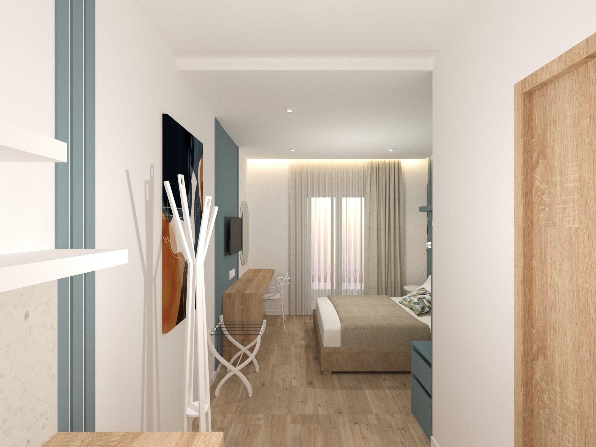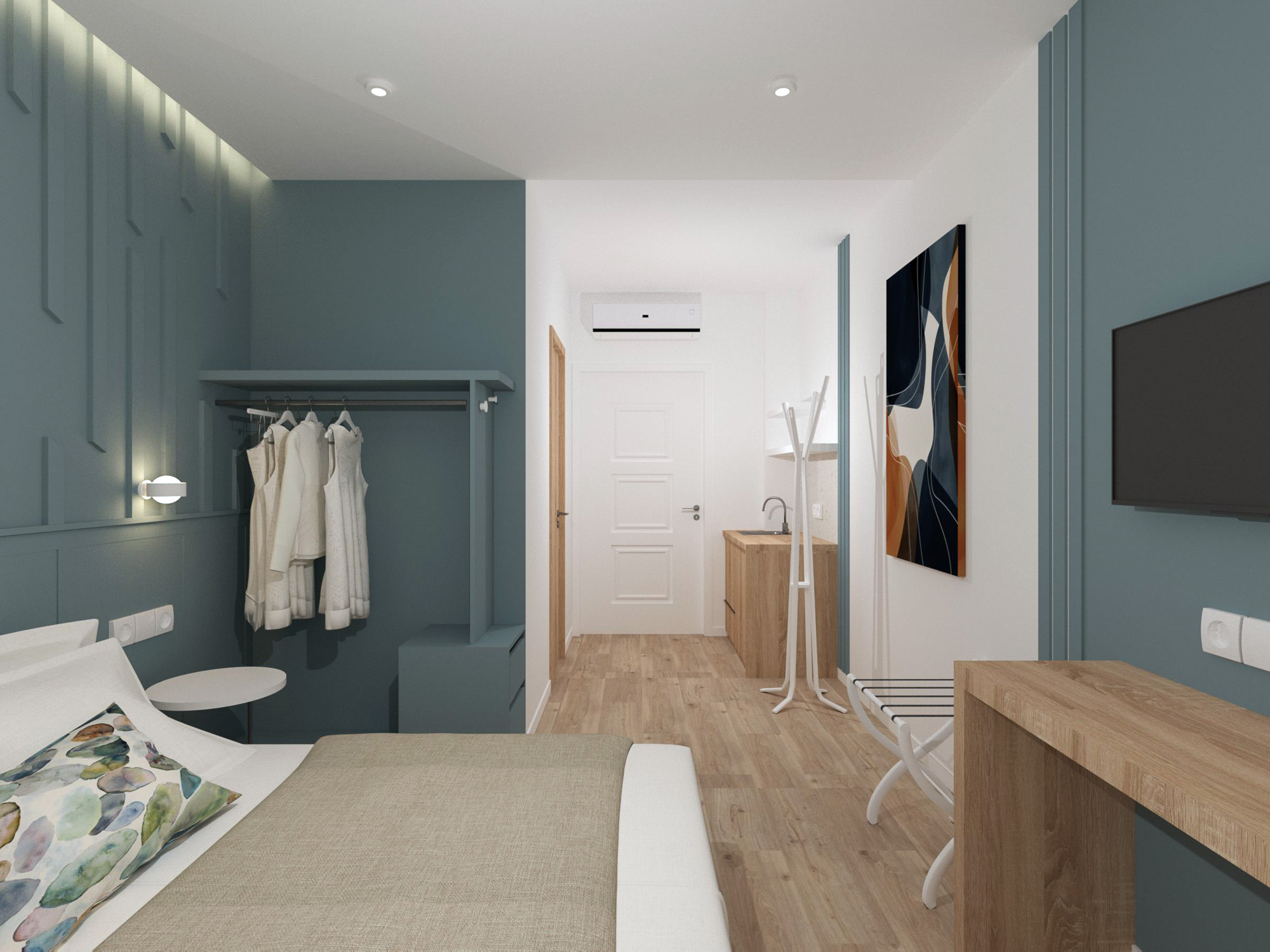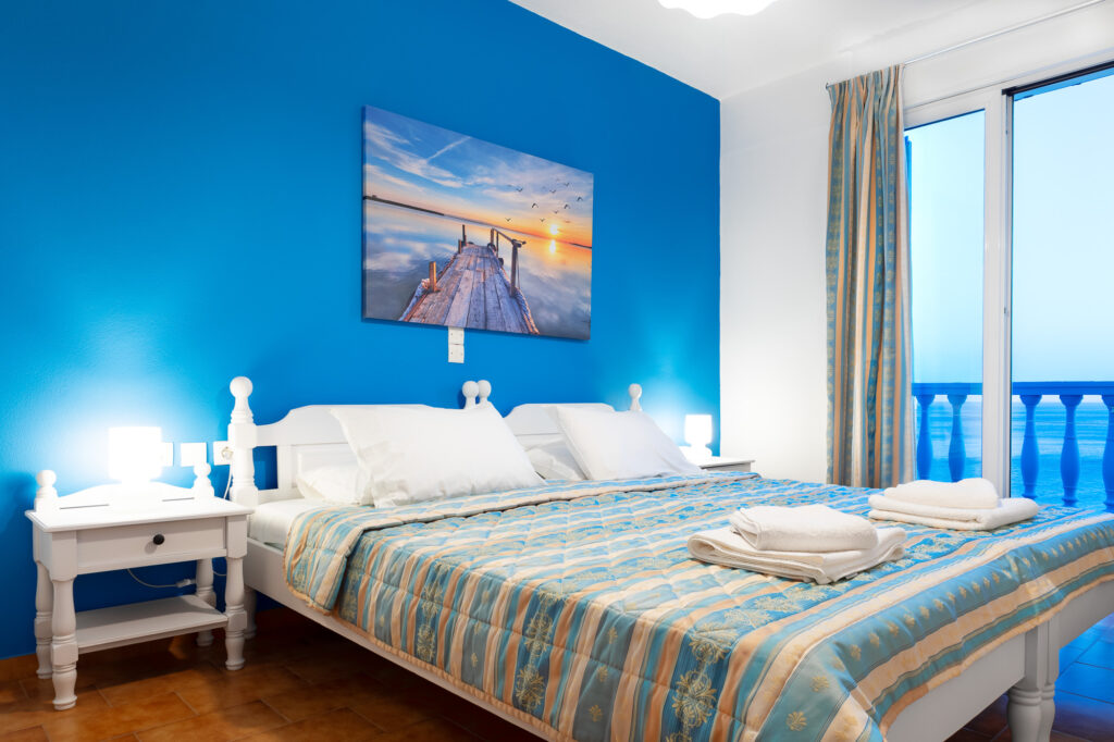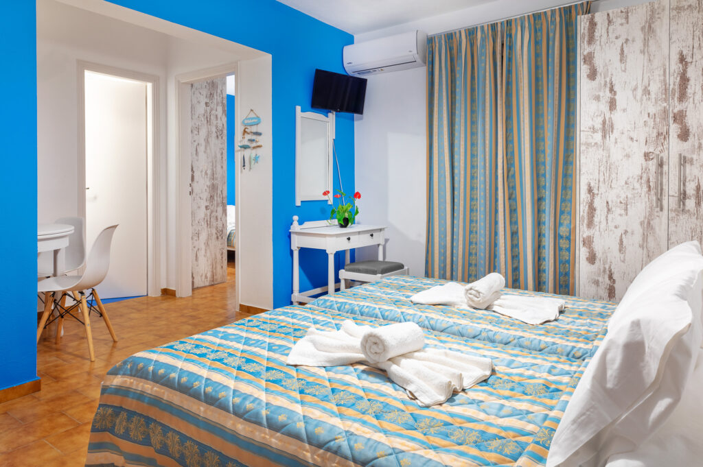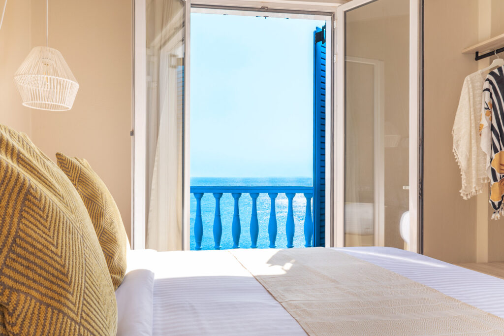 The property features four different room types: Deluxe Double Sea View Room and Deluxe Triple Sea View Room for 2–3 guests, as well as two more spacious options – the Superior Sea View Apartment and the Two-Bedroom Sea View Apartment, which comfortably accommodate up to 4 people. All spaces are bright, with simple, modern décor and balconies overlooking the sea, so you can enjoy the view from morning until sunset.