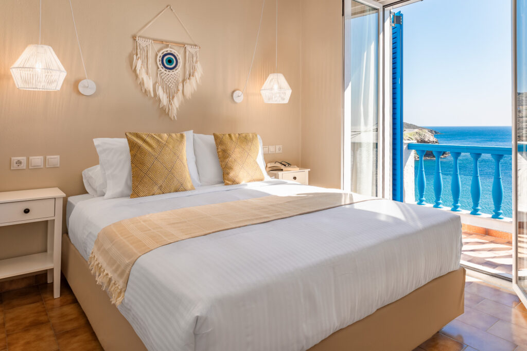 Apanemo Seaside is set in a quiet spot in Batsi, just a few minutes’ walk from the centre and the beach, offering welcoming accommodation with beautiful views of the Aegean. It’s an ideal choice for couples, families and small groups who want to stay close to tavernas, cafés and shops, while still enjoying the peace of a calm neighbourhood with panoramic sea views.