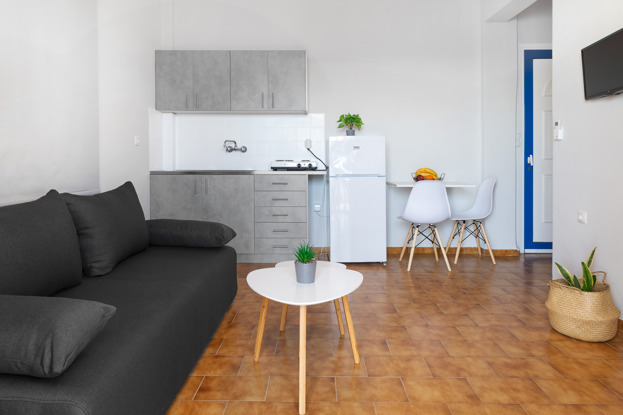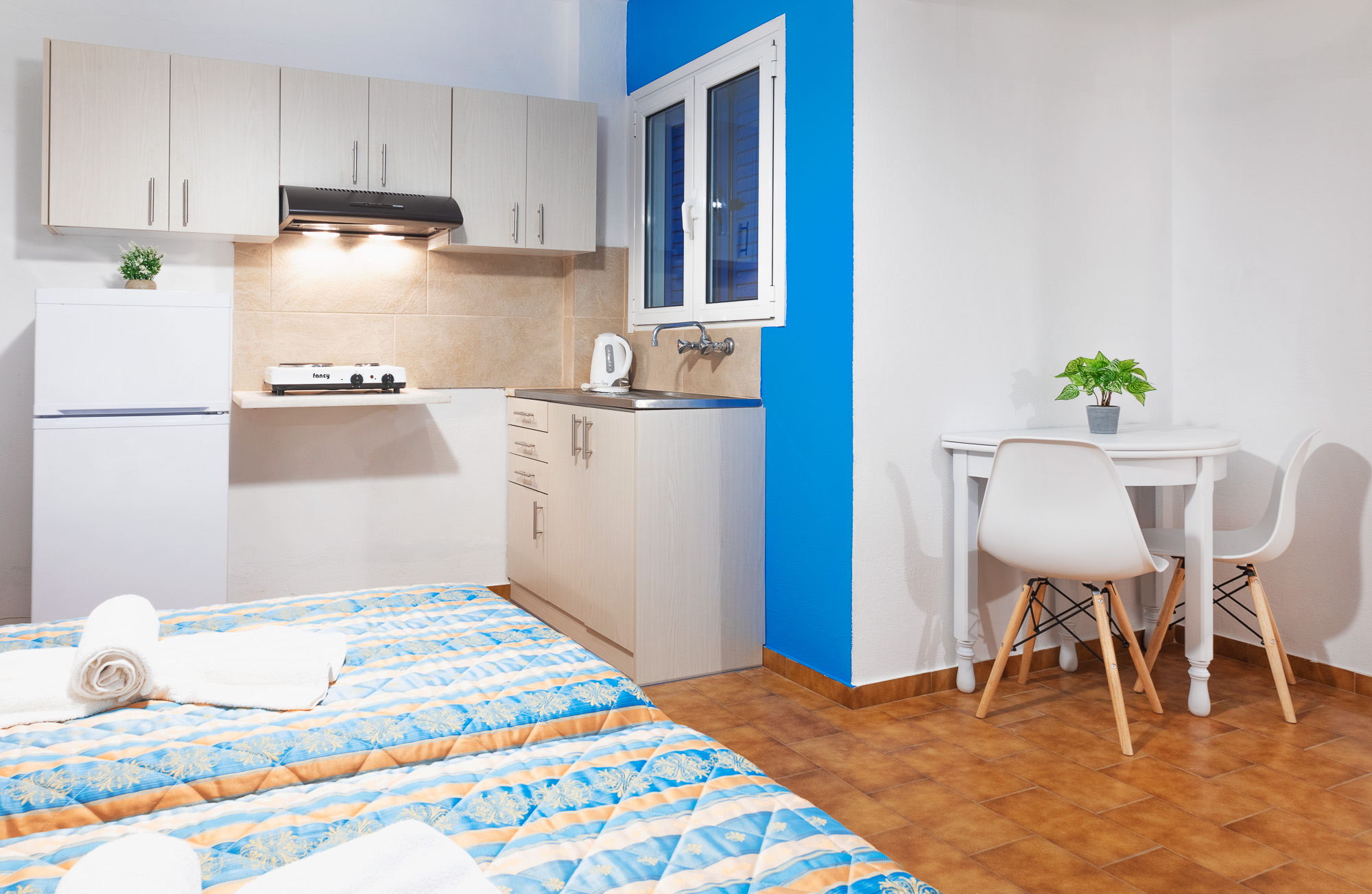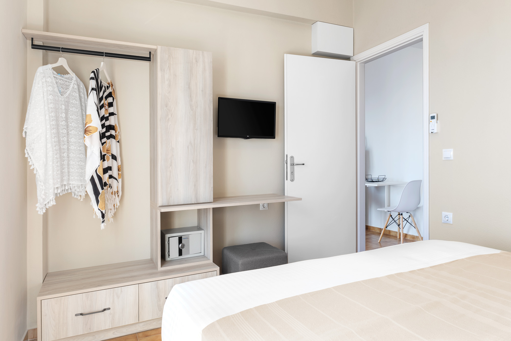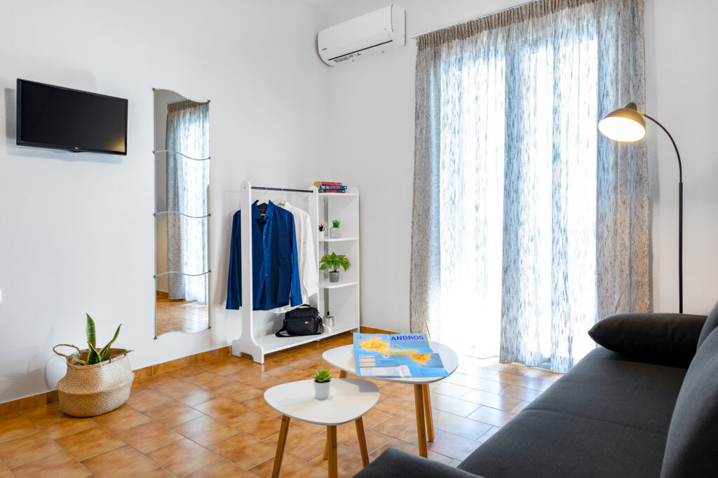 Every room and apartment includes air conditioning, free Wi-Fi, TV, fridge, espresso machine, private bathroom with shower, hairdryer and safe, while the apartments also offer a small kitchenette with basic equipment for preparing a simple breakfast or snack. Daily cleaning and the personal care of the owners make your stay particularly comfortable, and the location, about 300 m from the centre of Batsi, close to the bus stop and to both organized and smaller nearby beaches, makes Apanemo Seaside an ideal base for exploring Andros.