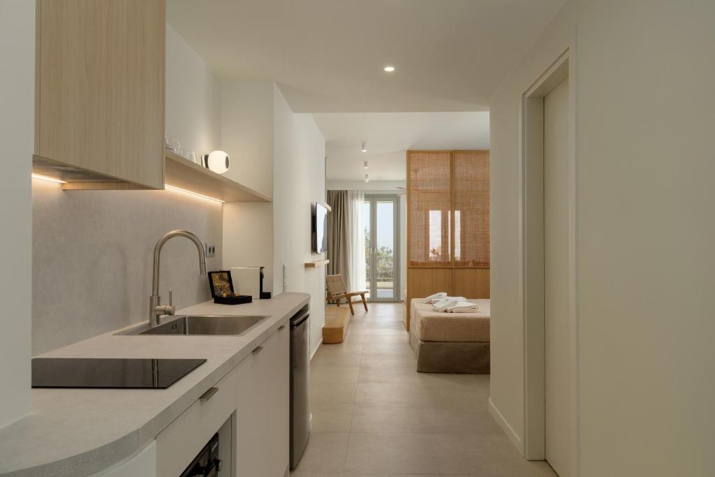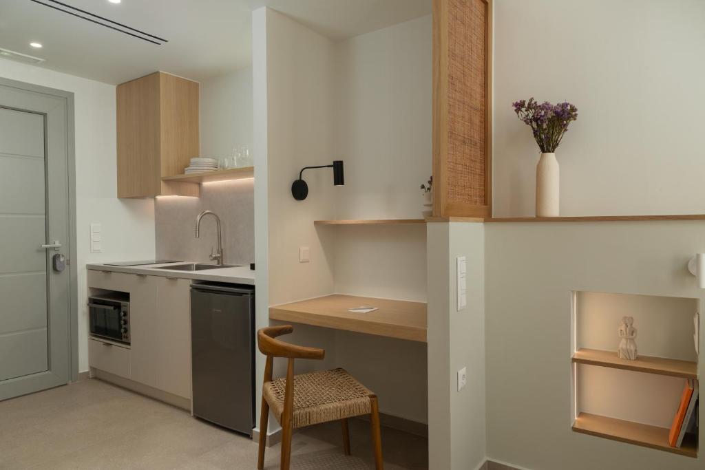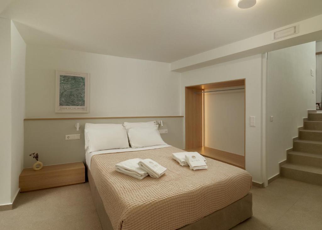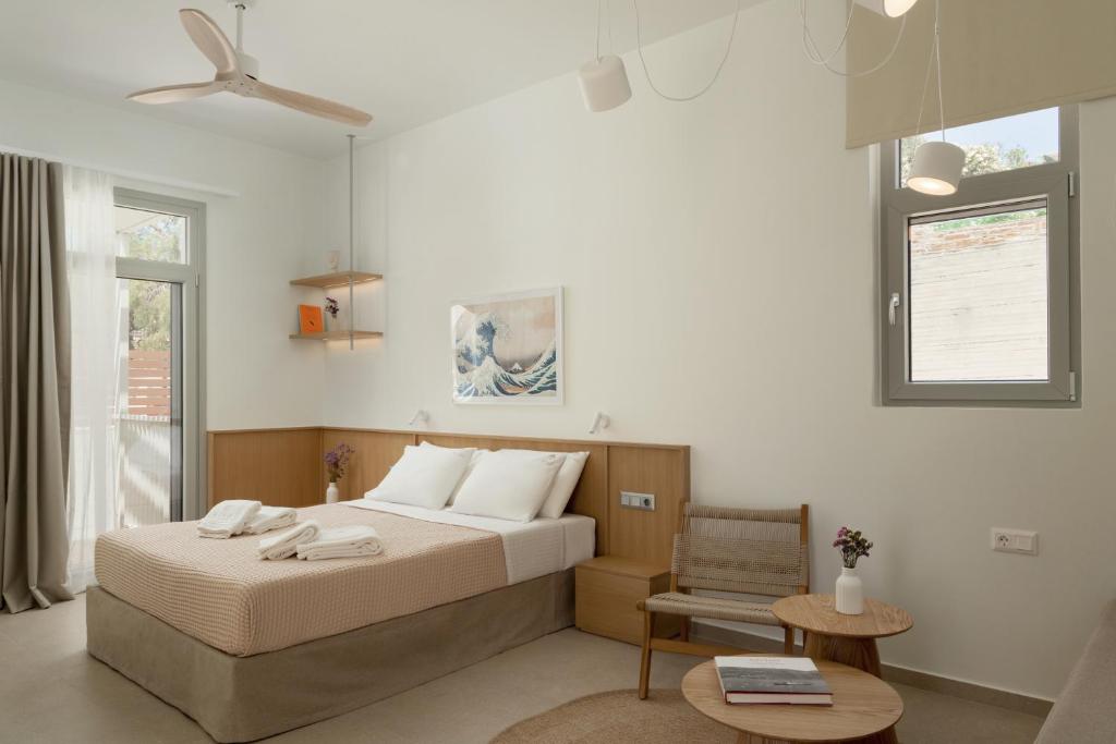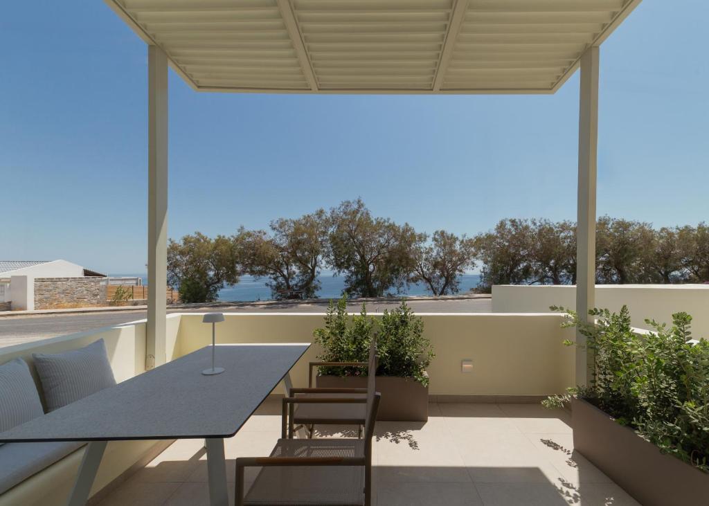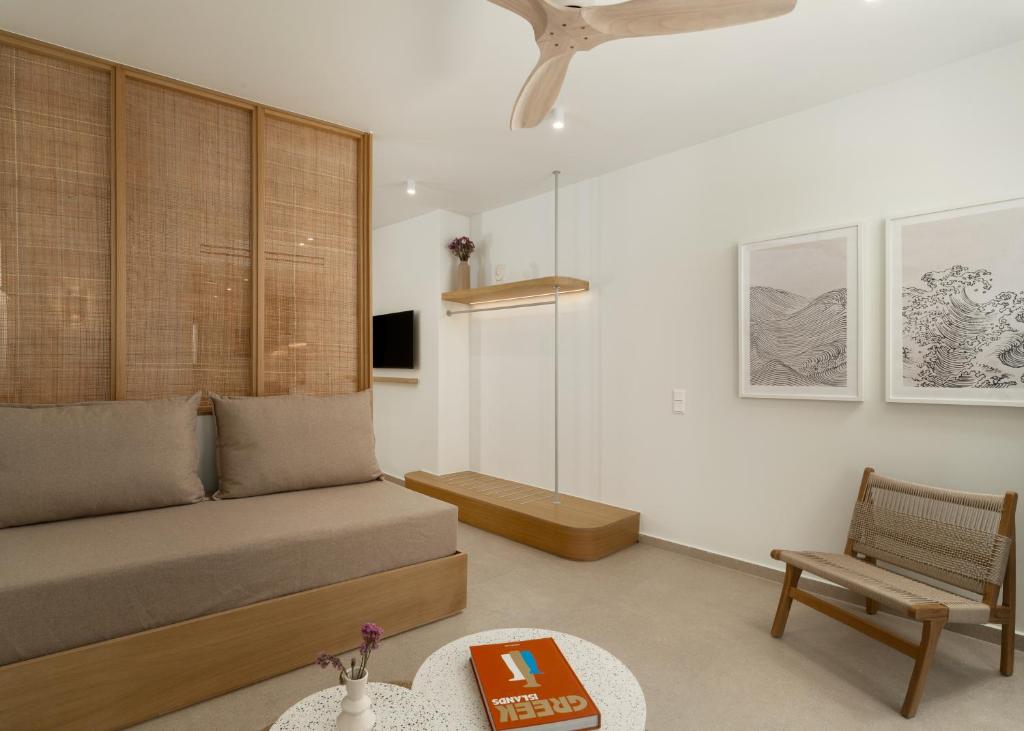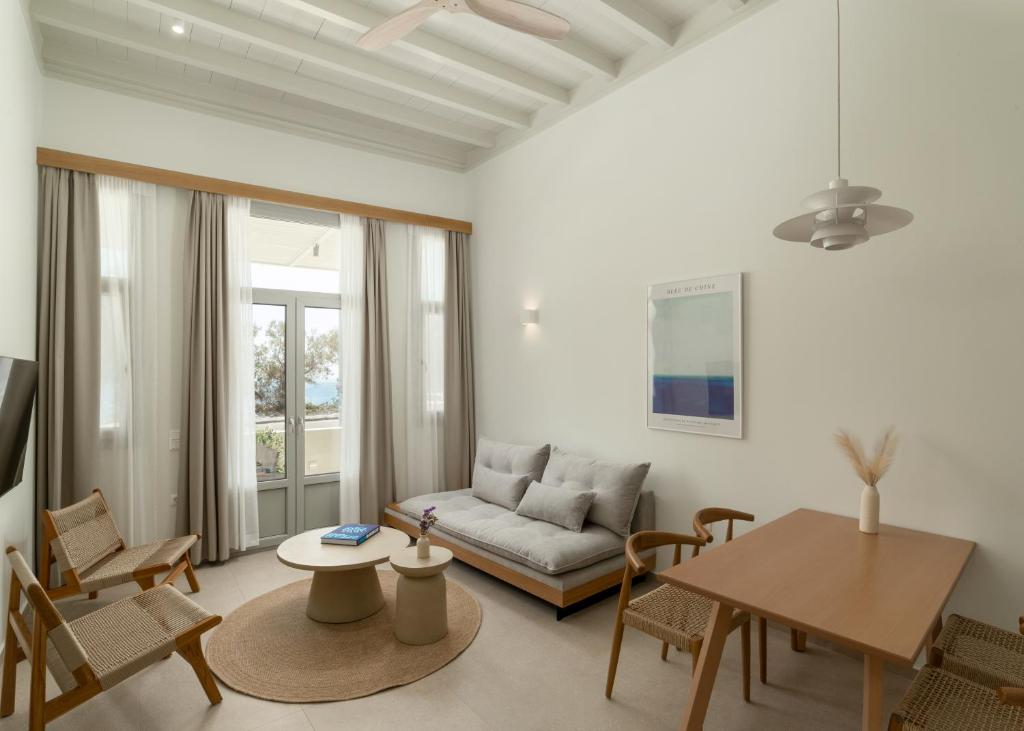 Each suite is carefully curated, with minimalist design, earthy tones and attention to detail. They feature a fully equipped kitchenette, comfortable living areas, quality bedding, private balconies with sea or garden views and high–speed Wi-Fi, creating a space that feels like your own island home – just with more elegance. With only four suites in total, the complex offers a sense of privacy, premium comfort and discreet service.